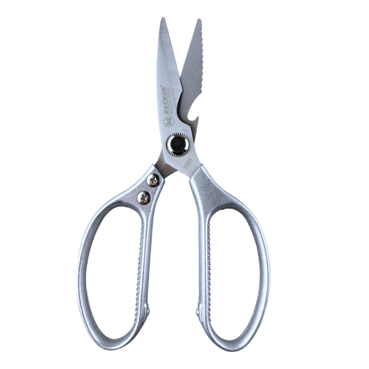 Универсальные ножницы отлично подойдут для использования на кухне - помогут открыть бумажный или пластиковый пакет, разделать птицу, рыбу. Острые и прочные лезвия кухонных ножниц не требуют частой заточки. Лезвия из нержавеющей стали. Ребристые металлические вставки на ручках предназначены для колки орехов. Специальное отверстие на лезвии с внешней стороны создано для открывания бутылок. Благодаря высокотехнологичному сплаву лезвия устойчивы к коррозии, их можно мыть в посудомоечной машине. Эргономичные кольца обеспечивают удобные захват и комфорт при работе с ножницами. Ножницы выполнены в классическом серебристом дизайне. Данная модель — незаменимый помощник на кухне любой хозяйки.
