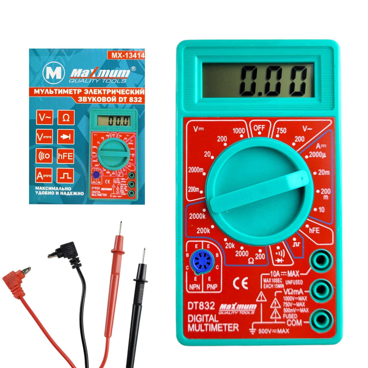 Мультиметр портативный цифровой от "Maximum Quality Tools" DT 832 позволяет производить тестирование диодов, работает в режиме "прозвонка" и при этом фиксирует результаты измерений. На табло можно контролировать индикацию заряда батарейки, перегрузки и индикацию полярности. В комплект входит пара тестовых контактов: красный и чёрный их длина 105 см. Измеряемые наконечники острые и имеют длину 15 мм. Размеры прибора 70 на 120 мм. Портативный мультиметр определяет переменное напряжение в диапазоне от 200 В до 750 В, постоянное – в диапазоне от 200 мВ до 1000 В. Силу тока определяется в диапазоне от 2000 мкА до 10 А, сопротивление цепи – от 200 Ом до 2000 КОм. Погрешность измерений составит 1%.