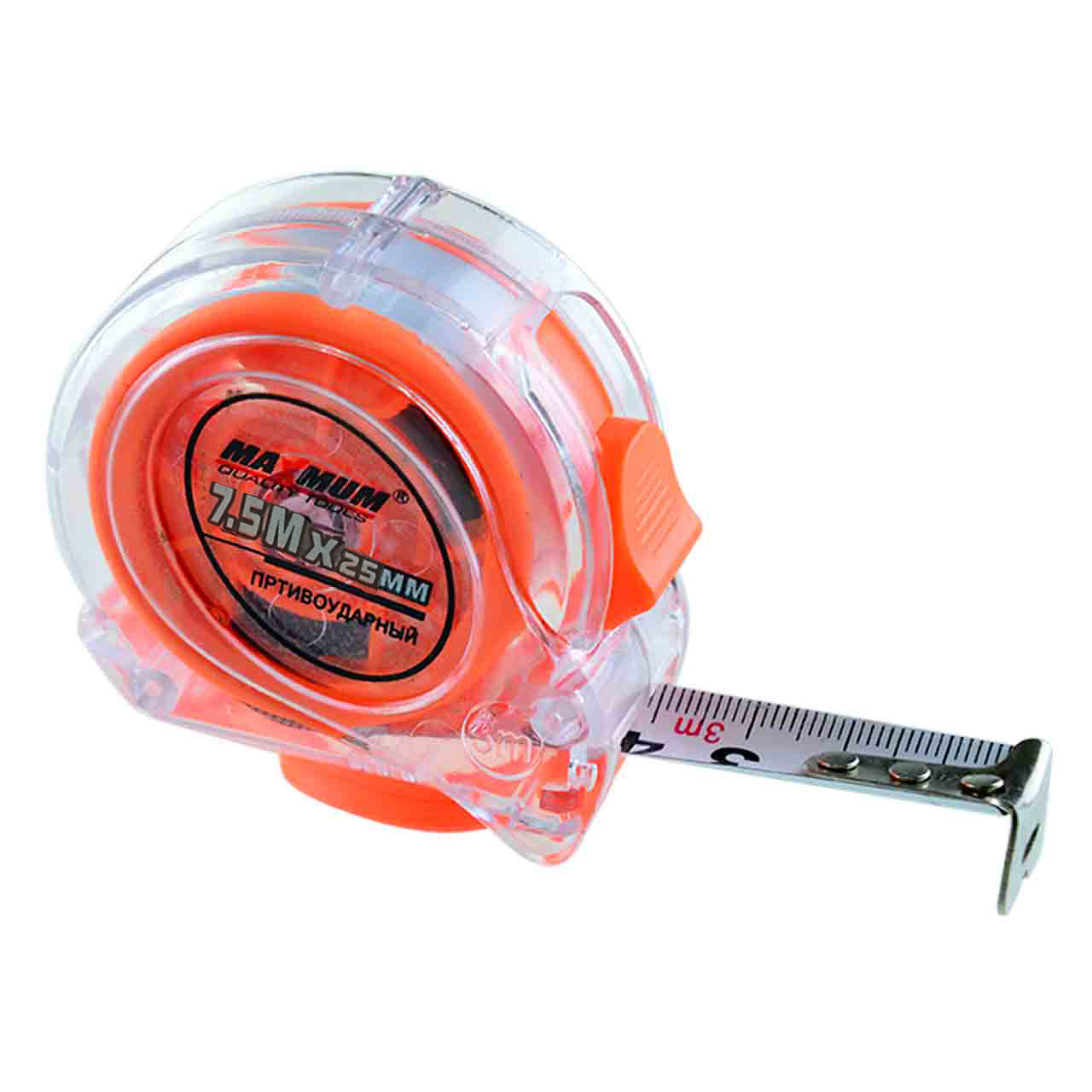 Рулетка измерительная 7,5 м*25 мм от бренда "MAXIMUM" выполнена в стильном прозрачном дизайне и имеет силиконовый ремешок в комплекте.