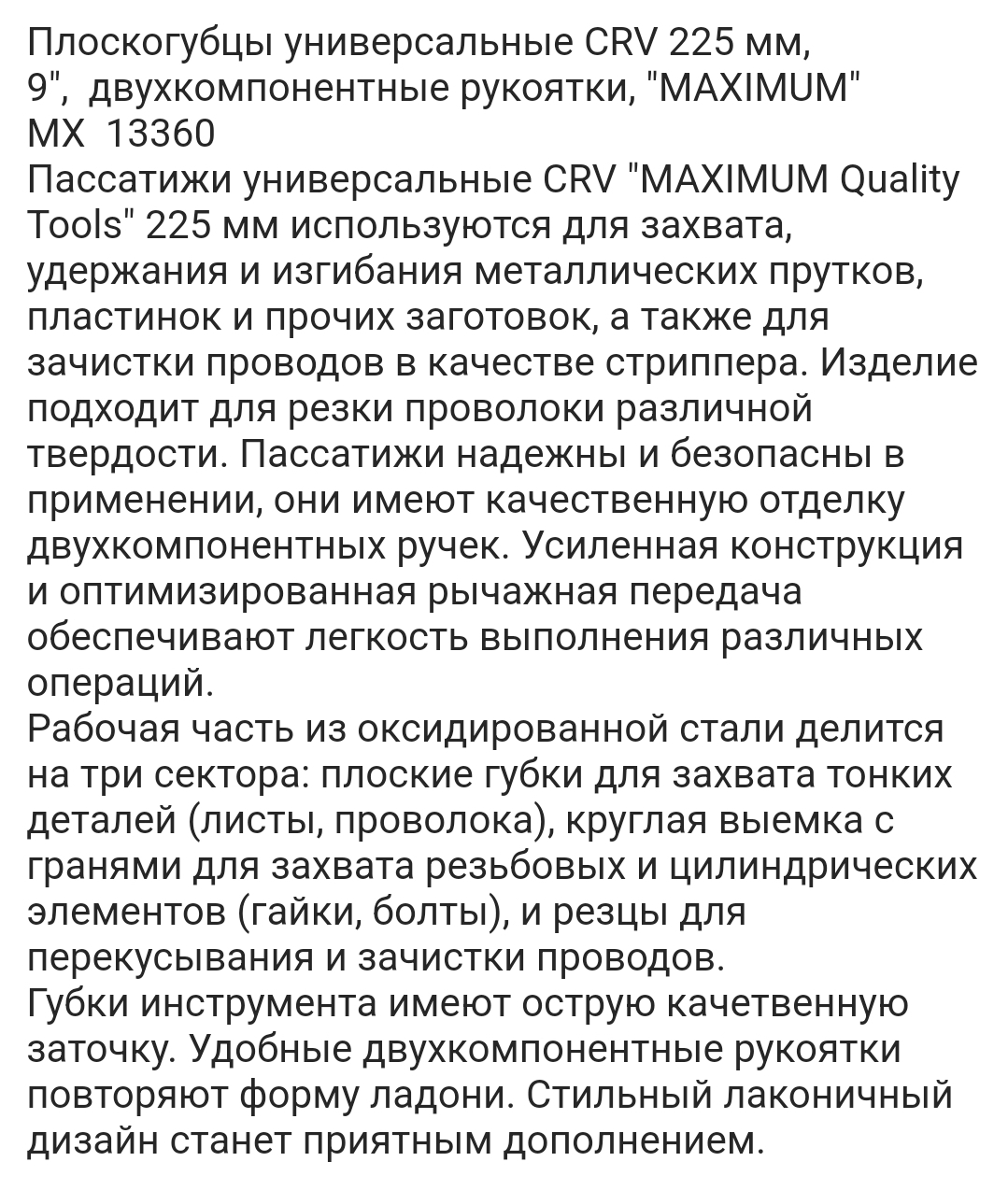 Пассатижи универсальные CRV "MAXIMUM Quality Tools" 225 мм используются для захвата, удержания и изгибания металлических прутков, пластинок и прочих заготовок, а также для зачистки проводов в качестве стриппера. Изделие подходит для резки проволоки различной твердости. Пассатижи надежны и безопасны в применении, они имеют качественную отделку двухкомпонентных ручек. Усиленная конструкция и оптимизированная рычажная передача обеспечивают легкость выполнения различных операций.