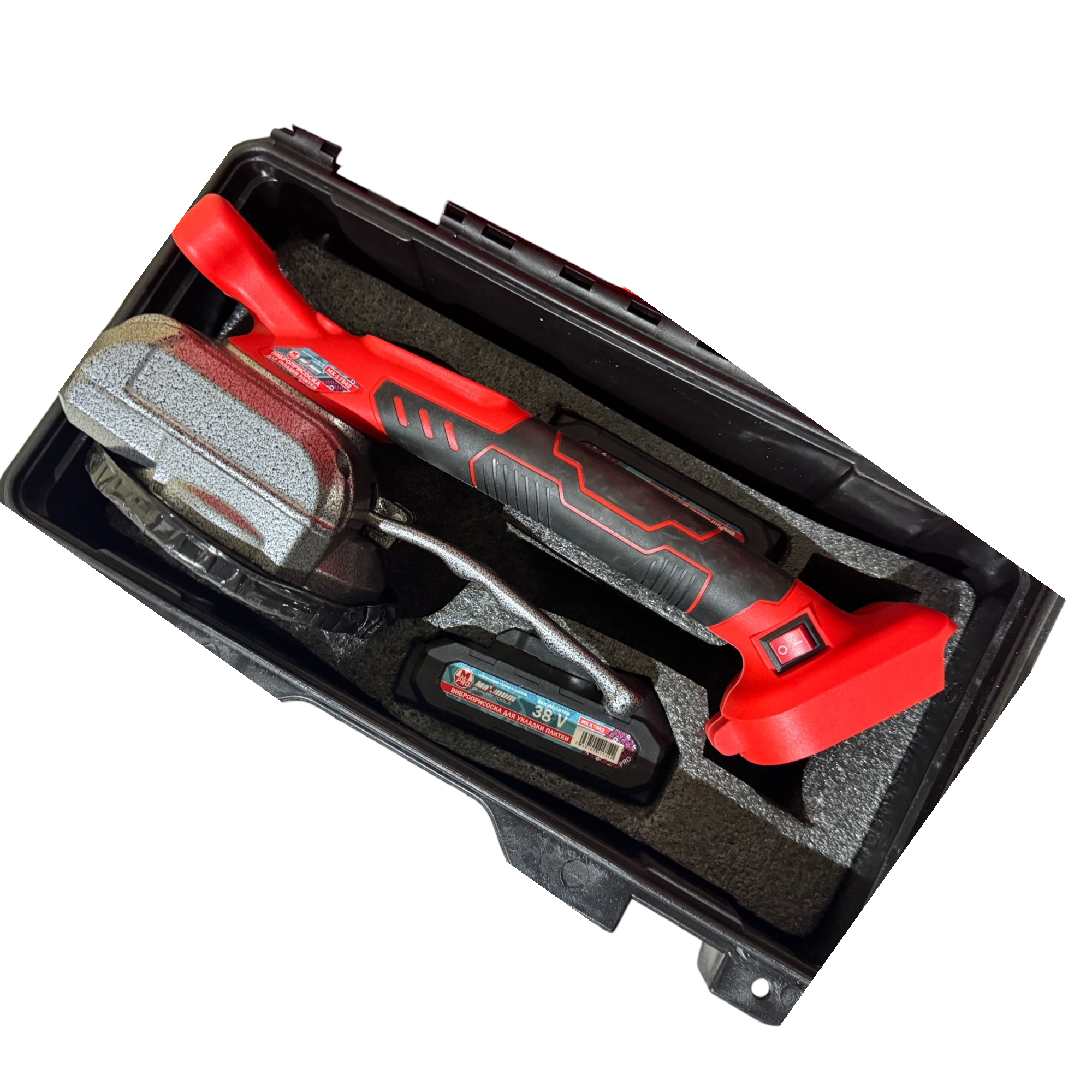 Виброприсоска для укладки и осаживания плитки поставляется в комплекте с 2-мя литиевыми аккумуляторами на 38 V. Это устройство 2 в 1: присоска и минивибратор. Поглощающая способность 100 кг. Мощная резиновая присоска диаметром 125 мм разработана для перемещения и подъёма плитки даже с небольшой шероховатой поверхностью или рельефом.